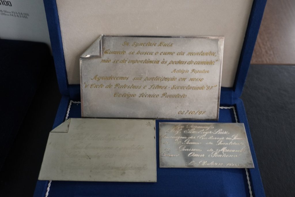 Placas comemorativas que simbolizam história, conquistas e parcerias construídas ao longo do tempo.